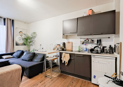L'appartement comporte un séjour avec cuisine, un coin chambre séparé et une salle de douche avec toilette et lavabo.